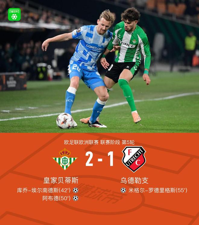 北京时间11月28日,欧国联第五轮比赛开始。皇家贝蒂斯和乌得勒支在一条狭窄的道路上比赛。皇家贝蒂斯凭借安东尼的助攻和库乔·埃尔南德斯的进球首开纪录。换边回归的福纳尔斯继续进攻,阿布德回应得分,帮助球队扩大领先优势。随后乌得勒支开始反击,艾利助攻米格尔·罗德里格斯进球,帮助球队取得胜利。此后两队都未能扳平比分,皇家贝蒂斯在比赛最后几分钟以2-1击败乌得勒支。关键比赛第42分钟,安东尼接库乔·埃尔南德斯助攻头球破门。贝蒂斯 1-0。第50分钟又取得了一场胜利。左右调整内侧,从近角度拍摄。贝蒂斯 2-0。第55分钟,米格尔·罗德里格斯中场直接破门。乌德勒支1-2。在伟大的时刻他进入了两队球员都参加了比赛e.比赛进行到第9分钟,贝蒂斯开局被动。第38分钟,德奥萨替补登场。第38分钟,德奥萨外围射门,皮球高出球门。第42分钟,安东尼接库乔·埃尔南德斯助攻头球破门。贝蒂斯 1-0。第50分钟又取得了一场胜利。阿布登调整射门,近角得分。贝蒂斯 2-0。第55分钟,米格尔·罗德里格斯中场直接破门。乌德勒支1-2球队阵容技术统计