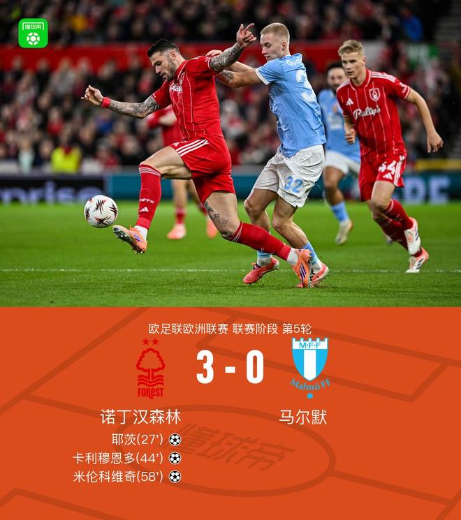 北京时间11月28日,欧洲联赛第五轮比赛,诺丁汉森林队主场迎战马尔默。比赛中,耶茨率先打破球队僵局,帮助诺丁汉森林取得领先。随后卡里蒙多在队友的帮助下进球,进一步扩大了领先优势。下半场,米伦科维奇抓住进攻机会,将球打入对方球门,为球队锁定了胜利。最终全场比赛结束,诺丁汉森林3-0马尔默。我们在一场重要比赛的第27分钟取得领先。耶茨也从球门上方射门得分。第44分钟,诺丁汉森林1-0。第44分钟,卡里蒙多禁区内再次射门。诺丁汉森林2-0。第58分钟,米伦科维奇门前推射破门。诺丁汉森林3-0。两支球队的球员都参加了比赛。尼古拉斯·多明戈斯在比赛开始六分钟后匆忙取得领先,阿伯特进行了调整第20分钟,他的抽射破门。球越过了球门。第27分钟,他们取得领先。耶茨在三分线外得分。第44分钟,诺丁汉森林1-0。第44分钟,远藤卡里姆禁区内射门。诺丁汉森林2-0。第58分钟,米伦科维奇门前推射破门。诺丁汉森林3-0球队阵容技术统计【咪咕独家观看英超】