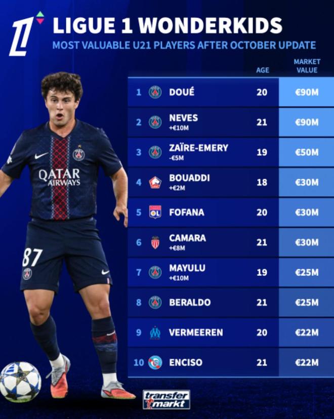 北京时间10月11日,在更新法甲球员身价后,德胡安还列出了法甲U21的前10名球员。巴黎圣日耳曼队位列前三,杜埃和若奥·内维斯以9000万欧元的薪酬并列第一。法国U-21身价前10名球员: 1.杜埃(20岁,巴黎圣日耳曼)9000万欧元 2.若奥·内维斯(21岁,巴黎圣日耳曼)9000万欧元(+1000万欧元) 3.扎伊尔·埃梅里(19岁,巴黎圣日耳曼)5000万欧元(-500万欧元) 4.阿尤布·布阿迪(18岁,里尔)3000万 欧元(+200万欧元)5.马利克·福法纳(20岁,里昂)3000万欧元6.拉明·卡马拉(21岁,摩纳哥)3000万欧元(+800万欧元)7.迈鲁(19岁,巴黎圣日耳曼)2500万欧元(+1000万欧元)8.卢卡斯·贝拉多(21岁,巴黎圣日耳曼) 2500万欧元 9. Vermeulen (20 岁)10。 enciso(21岁,斯特拉斯堡)2200万欧元